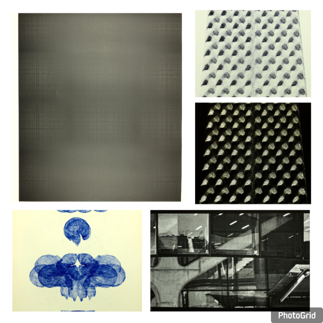 Nominováni na cenu: Roman Křelina – Enigma, kombinovaná technika, tisk ze 2 borovicových válců, číselná raznice, plátno, 1250 x 2150 mm, 2025, Lenka Sukeníková – It Grows – diptych, monotypie, 2025.